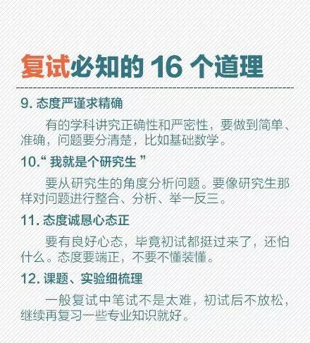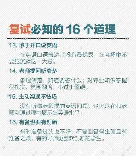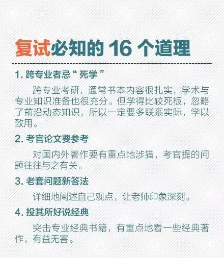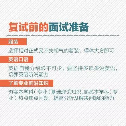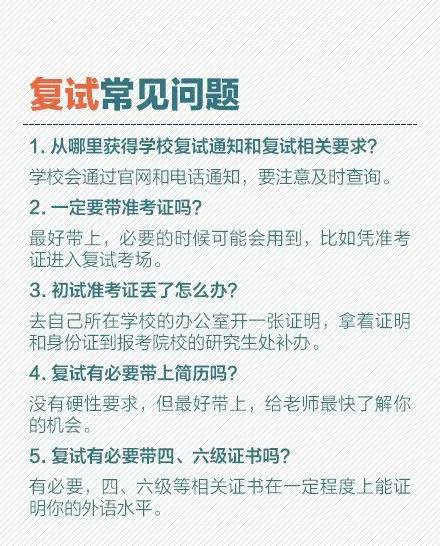 党们放松的神经又该绷紧了有木有!复试都要准备哪些材料?复试面试怎么着装比较好?老套的面试问题,如何回答才出彩?考研复试,你必须知道的那些事。不放过任何一次机会,有备才能无患,转给考研党!